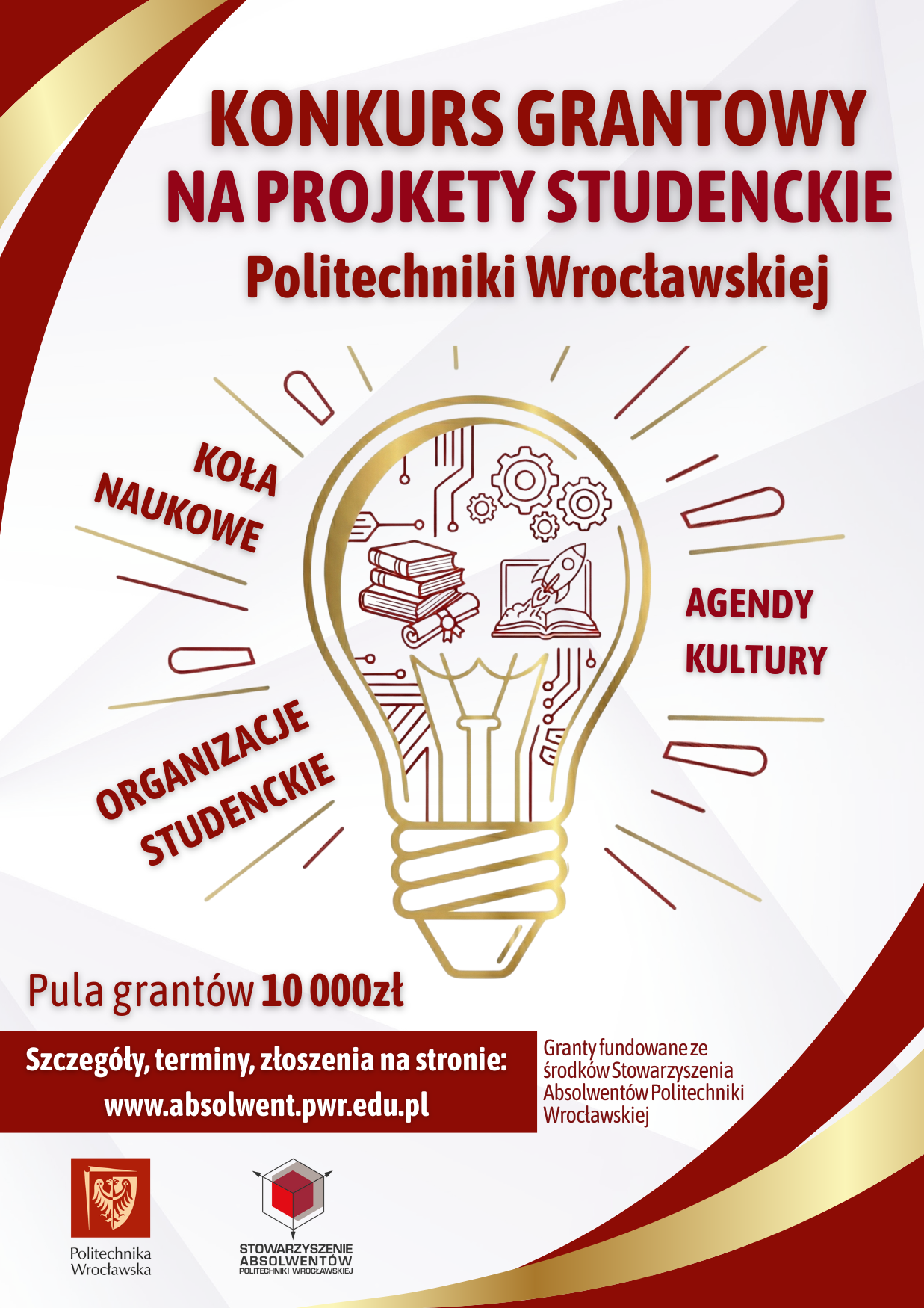 Stowarzyszenie Absolwentów Politechniki Wrocławskiej ogłasza konkurs grantowy na projekty społeczne wzmacniające więzi, integrujące środowisko studenckie oraz pielęgnujące wspólnotę akademicką Politechniki Wrocławskiej.