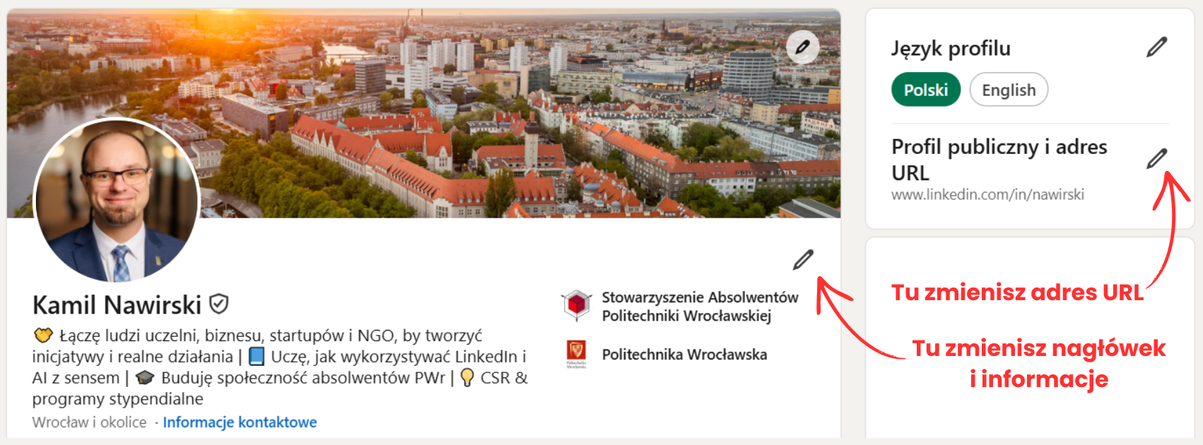 - Personalizacja URL: Zmień losowy ciąg znaków w adresie profilu na swoje imię i nazwisko.